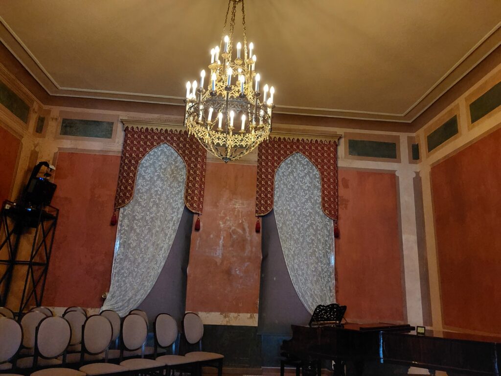 “Tas ir laiks, kad historisma periodā apgūst kaut ko no senā ar jaunām vīzijām. Ja mēs skatāmies uz pili, tad tā izskatās kā no ģeometriskām figūrām savienota kopēja kompozīcija. Vidū ir rizolīts, kas ir raksturīgs gotikai, - astoņstūru ģeometriska figūra, ja skatītos no augšas. Augšā ir izkārtoti dzeguļi – robota mala, kas ir raksturīgi viduslaiku pilīm. Tornis ir izvietots asimetriski. Noformējumā izmantoti trīslapji vai četrlapji un Tjudoru gotiskās rozes. Pils ir unikāla ar to, ka pilī ir dažādos mākslas stilos iluzori rotātas telpas. Piemēram, pie griestiem ir grifi, kas izskatās kā skulptūras, kas ir uzsēdinātas uz portika. Izskatās, ka tā ir 3D projekcija, bet patiesībā tas ir ļoti profesionāls mākslas darbs, kas ir uzgleznots telpiski. Šādi telpiskie rotājumi ir katrā telpā. Telpas ir neoklasicisma, neorenesanses stilā, svinību zāle – neorokoko, koridors – neogotikas stilā, vējtverī – neomauru stils,” stāsta pils gide Jolanta Baldiņa.