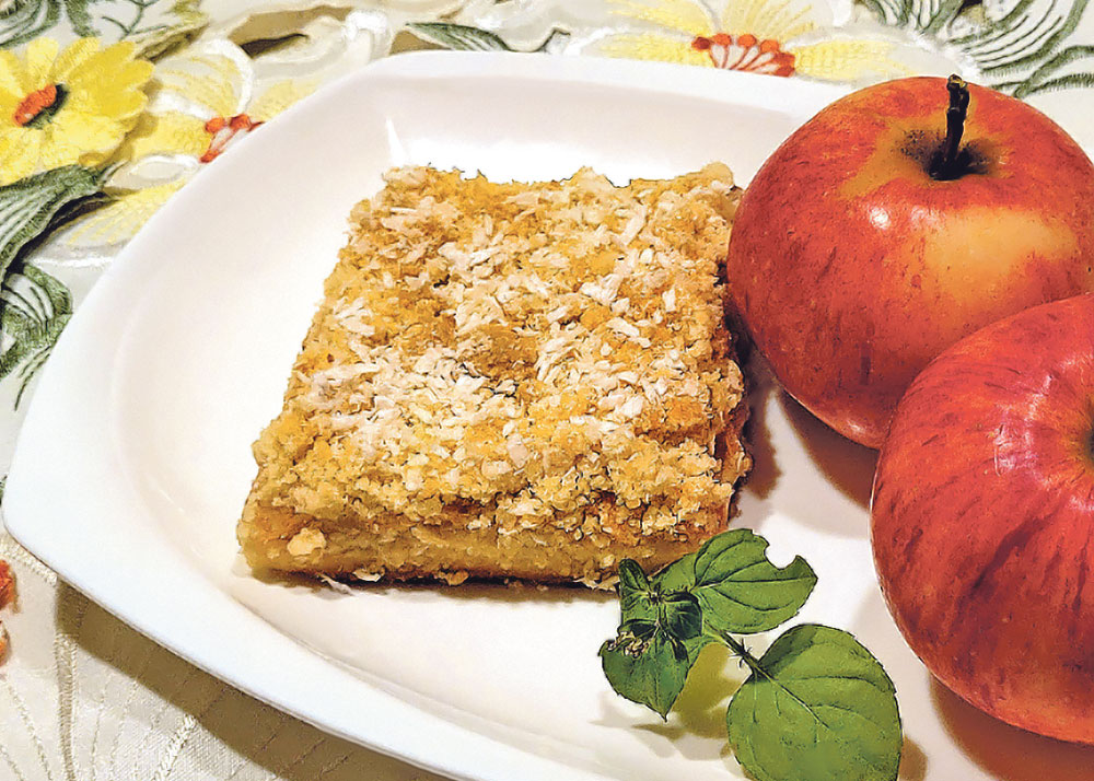 Taisnstūra veidni (man bija 25×20 centimetru) ietaukoju ar augu eļļu un izlīdzināju tajā ābolus mīklā. Cepu līdz 180 grādiem uzkarsētā cepeškrāsnī 30 minūtes.