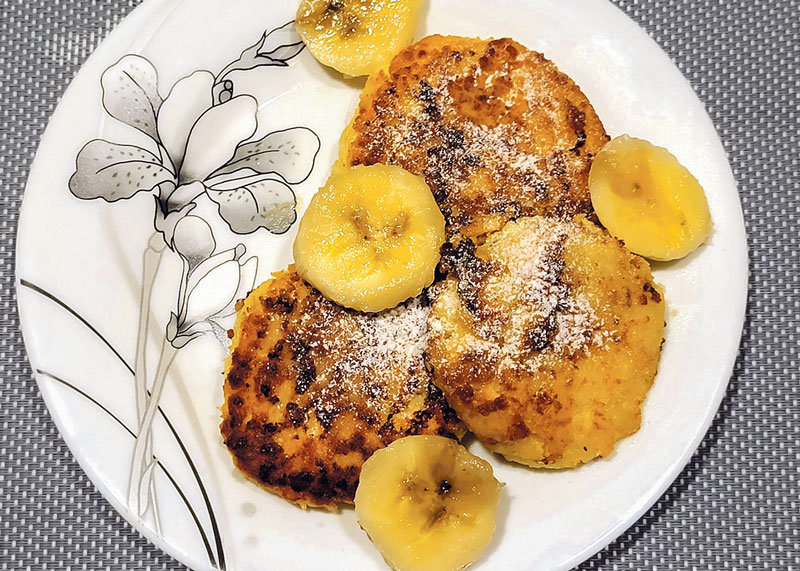Biezpienam pievienoju olu, cukuru, vaniļas cukuru, sāli un kokosriekstu skaidiņas un visu kopā labi samaisīju. Atstāju masu mierā kādas 20 minūtes. Banānu nomazgāju, nomizoju un sagriezu ripiņās. Pēc tam ar karoti ņēmu pagatavoto biezpiena masu, vidū ieliku un apslēpu pa banāna ripiņai, un, stingri piespaidot, veidoju plācenīšus. Pēc tam tos apviļāju miltos un cepu pannā ar olīveļļu no abām pusēm, līdz tie kļuva zeltaini. Tā kā šoreiz izmantotais biezpiens bija gadījies pasauss, plācenīšus apgriezt cepšanai no otras puses vajadzēja uzmanīgi, lai tie neizjuktu. Gatavus tos vēl pārkaisīju ar pūdercukuru. Pirms celšanas galdā plācenīšus varam rotāt arī ar augļiem vai kādu odziņu.