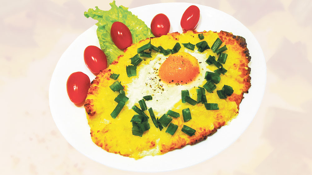 Biezpienu samaisīju kopā ar rīsu miltiem, sāli, cepamo pulveri un vienu olu. (Abām pārējām olām atdalīju atsevišķi dzeltenumus un baltumus.) Samīcīju mīklu un sadalīju to divās daļās. Uz plāts, kas izklāta ar cepamo papīru, no mīklas saplacināju divus plāceņus, tos pārkaisīju ar rīvētu sieru un izveidoju garenas “laiviņas” ar apmalītēm. Liku cepties līdz 180 grādiem uzkarsētā cepeškrāsnī minūtes 15. Tad tām katrai vidū ielēju pa olas baltumam un apmalītes pa perimetru vēl apkaisīju ar rīvētu sieru. Cepu vēl apmēram desmit minūtes. Pāris minūtes pirms gatavības tajās ieliku pa olas dzeltenumam. Gatavās “laiviņas”, kas līdzinājās tradicionālajam gruzīnu virtuves ēdienam hačapuri, ko gan man nav izdevies nobaudīt, bet tikai attēlos redzēt, varam pasniegt kopā ar zaļumiem.