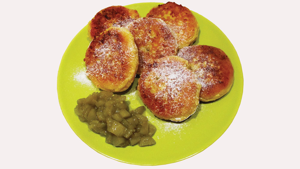 Samaisīju biezpienu, sodu, olu, vaniļas cukuru un miltus un iejaucu mīklu, kas nelīp pie rokām. Lai tā būtu stingrāka un labāk veidojama, to vēl uz pāris stundām ievietoju ledusskapī. Pēc tam ar karoti ņēmu daļu mīklas, izveidoju bumbiņu, saplacināju, vidū ar karotīti ieliku rabarberu pildījumu, mīklu aizspaidīju, lai pildījums paliek vidū, un izveidoju plācenīti. Kopā no šā biezpiena daudzuma iznāca seši. Cepu tos pannā ar augu eļļu no abām pusēm līdz gatavībai – zeltainai garoziņai. Tā kā mīklai cukuru netiku pievienojusi, gatavos plācenīšus pārkaisīju ar pūdercukuru. Ja rabarberi vairs nav pieejami, pildījumam varam izmantot arī, piemēram, banānus kopā ar kādu biezu ievārījumu vai ābolus.
