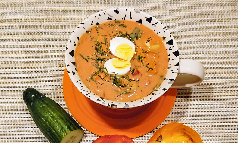 LAI GAN vasara straujiem soļiem dodas pretī rudenim, ir arī siltākas dienas, un tad taču vēlamies nodoties citām nodarbēm, nevis stundām ilgi stāvēt pie plīts, tādēļ šāda recepte vēl būs īsti piemērota. Šoreiz zupai izvārīju vairākas paipalu oliņas – tam pēc ūdens uzvārīšanās bija nepieciešamas minūtes trīs. Tad tās atdzesēju aukstā ūdenī, nolobīju un sagriezu kubiņos. Vistas olas vāru 10 līdz 12 minūtes – atkarībā no to lieluma. Noskaloju dārzeņus un zaļumus. Dilles un lociņus sasmalcināju. Gurķus nomizoju, pārgriezu gareniski četrās daļās un tās plāni sagriezu. Tomātus – krāsainumam izmantoju arī dzelteno – sagriezu kubiņos.