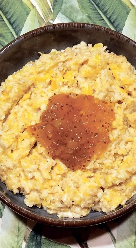 Nomizotu attiecīga lieluma ķirbja gabalu sarīvēju uz rupjās rīves. Katliņā sviestā sarīvētos ķirbjus apmaisot apcepu. Cepšanas režīmā multivārāmajā katlā tam būtu vajadzīgas desmit minūtes. Pēc tam pievienoju ātri vārāmās pilngraudu auzu pārslas, cukuru un vārītu ūdeni un pavārīju dažas minūtes. (Parastās auzu pārslas multivārāmajā katlā biezputras režīmā būtu kopā ar ūdeni un cukuru jāvāra desmit minūtes, jāpielej saldais krējums un jāvāra vēl minūtes desmit.) Tad pielēju saldo krējumu un visu labi izkarsēju. Uzliku katlam vāku un ļāvu putrai vēl pāris minūtes uzbriest. Tad to baudīju kopā ar mango ievārījumu ar čijas sēkliņām.