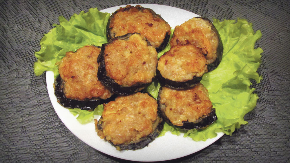 Katrai baklažāna ripiņai uzliku malto gaļu, izlīdzināju pa visu virsu un piespiedu, lai veidojas plācenītis. Tos apviļāju vispirms miltos, pēc tam – sakultās olās. Cepu pannā ar augu eļļu no abām pusēm – vispirms ar malto gaļu uz leju, pēc tam tos uzmanīgi apvērsu un cepu līdz gatavībai.