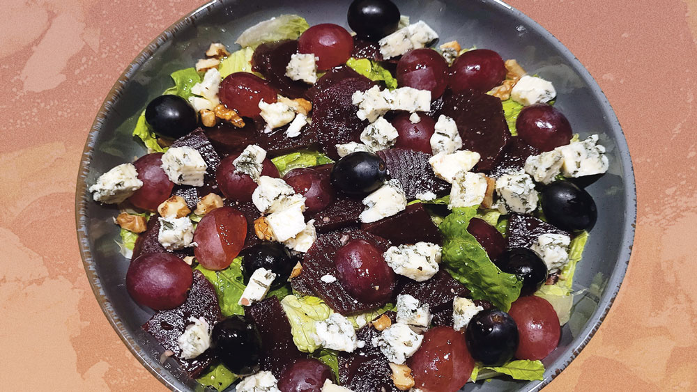 Traukā vispirms izkārtoju sagatavotās salātu lapas. Virs tām izliku vārītās bietes, tad – vīnogas, zilo sieru un sadrupinātus valriekstu kodolus. Mērcei labi samaisīju kopā olīveļļu (iesaka gan valriekstu eļļu, taču tādas dažādības mājās, protams, nav) ar baltvīna etiķi, sāli un pipariem garšai, piejaucot arī mazliet šķidra medus. Mērci pārlēju salātiem.