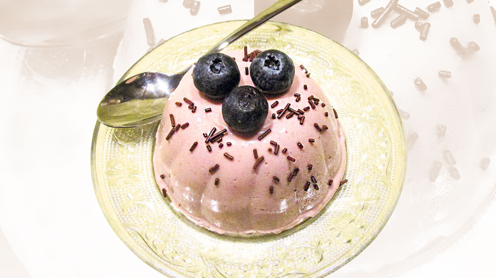 Želatīnu – kurš gan to ņemsies svērt, tādēļ ņēmu divas tējkarotes, zinot, ka vienā tā ir 5 grami, bet ēdamkarotē ir jau 15 gramu – aplēju ar pienu un atstāju uzbriest, pēc tam to izšķīdināju. Mīkstu pilnpiena biezpienu blendera krūzē samaisīju ar medu, nomizotu un sagrieztu banānu, kā arī ar iepriekš atlaidinātām saldētām zemenēm un saputoju viendabīgā masā. Pēc tam pielēju izkausēto želatīnu un turpināju putot vēl pāris minūtes. Putojumu salēju saldēdiena trauciņos un veidnītēs un ievietoju ledusskapī, lai gardā un reizē arī veselīgā masa sastingst. Rotājumam izmantoju svaigas lielogu mellenes un krāsainos cukura dekoriņus.