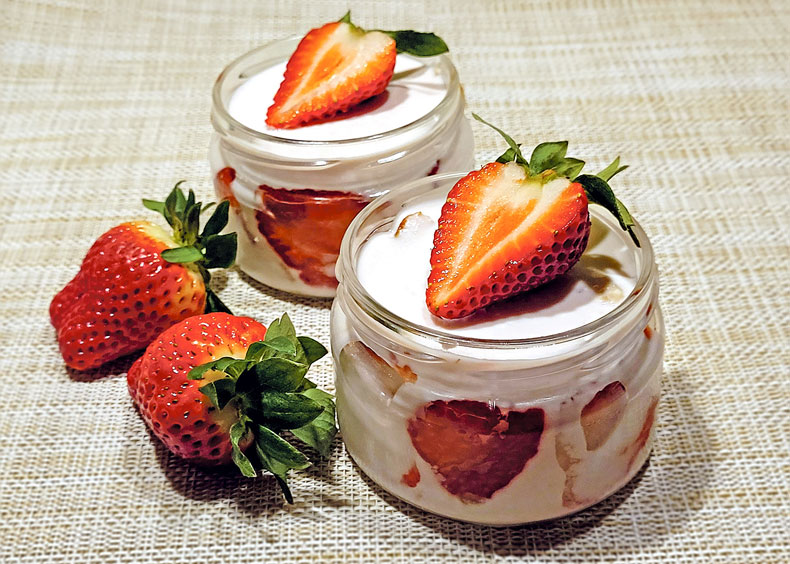 Kūciņu veidošanai izvēlējos mazās burciņas, protams, der arī lielākas vai deserta trauciņi. Burciņu apakšā izliku dažas biezpiena krēma karotes, tad – biskvīta kēksiņa gabaliņus un vēl krēmu. Gar trauciņu malām ar griezuma vietu pret ārpusi izkārtoju uz pusēm pārgrieztas zemenes. Ar ogām, biskvīta gabaliņiem un biezpiena masu piepildīju atlikušo burciņu daļu. Desertu ievietoju ledusskapī sastingšanai. Pirms baudīšanas to vēl varam rotāt ar ogām vai rīvētu šokolādi.