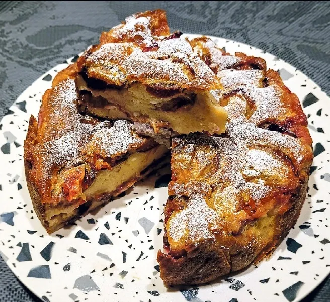 Pusi mīklas izlīdzināju sagatavotajā veidnē un pa virsu izkārtoju pusi plūmju. Pēc tam pārlēju atlikušo mīklu, izlīdzināju un pārsedzu ar atlikušajām plūmju pusītēm (ar griezuma vietu uz augšu), viegli iespiežot tās mīklā.