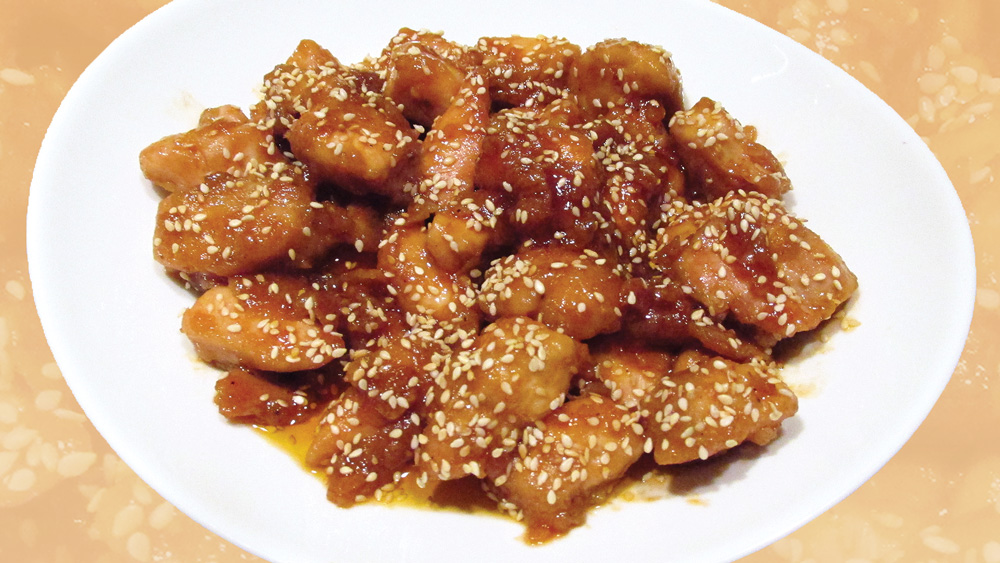Iemarinētos filejas gabaliņus apviļāju kukurūzas cietē un apcepu citā pannā ar augu eļļu. Pēc tam samaisīju gaļu ar medus mērci. Pirms baudīšanas visu vēl pārkaisīju ar apceptajām sezama sēkliņām.