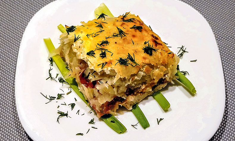Veidni mazliet ietaukoju ar augu eļļu un izkārtoju tajā sagatavotās filejas, pēc tam izliku sēnes ar sīpoliem, tad – tomātus un sīpolu lociņus, uzkaisot arī sāli. Virsū izlīdzināju rīvēto kartupeļu kārtu un arī tiem pārkaisīju sāli un piparus. Visbeidzot visu vēl pārsmērēju ar skābā krējuma kārtu un ievietoju līdz 180–200 grādiem uzkarsētā cepeškrāsnī. Pēc apmēram pusstundas ēdiens bija gatavs.