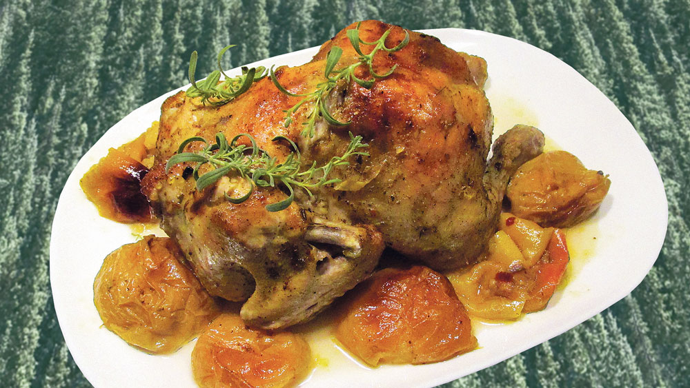 Cāli nomazgāju un labi apsusināju papīra dvielī. Eļļai pievienoju spiedē sasmalcinātus ķiplokus, sāli un piparus, cik nu šķita nepieciešams, kā arī nedaudz garšvielas vistas gaļas ēdieniem. Putniņu gan no iekšpuses, gan ārpuses “apmīļoju” ar šo maisījumu. Vienu ābolu sagriezu daiviņās un iepildīju cālī, turpat vēl – arī pārpalikušos sasmalcinātos ķiplokus. Ievietoju cāli cepammaisā. Tam līdzās izkārtoju atlikušos trīs ābolus – receptē, pēc kuras vadījos, gan bija ieteikts tos izmantot veselus, taču šoreiz ābolus pārgriezu uz pusēm un izņēmu tiem serdes. Maisu aizsēju, augšpusē to vēl dažās vietās sabakstīju ar iesmiņu un ievietoju nedaudz ar eļļu ietaukotā cepampannā. Liku cepties līdz 180 grādiem uzkarsētā cepeškrāsnī apmēram vienu stundu un 25 minūtes. (Atkarībā no putna lieluma cepšanas laiks var būt atšķirīgs. Labāk gan pārāk lielu cāli neizvēlēties – būs grūtāk panākt tā gatavību.) Pēc tam maisu virspusē atgriezu un cāli liku atpakaļ, nu jau nedaudz karstākā krāsnī, apcepties no augšas vēl minūtes 10-15. Ja viendabīgā biezenī sastampāsim izcepto ābolu un tam piemaisīsim ēdamkaroti skābā krējuma, ceptos ķiplokus, sāli un piparus, piedevām pie putna gaļas iegūsim arī gardu un pikantu mērcīti.