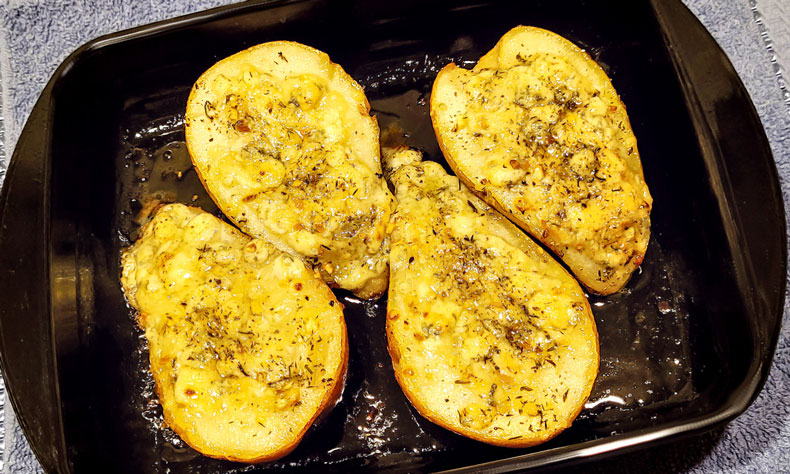 Pannā ar uzkarsētu nelielu daudzumu olīveļļas un mazliet sviesta apcepu bumbieru pusītes – apmēram pa trim minūtēm no katras puses. Augļiem jākļūst mīkstākiem. Pēc tam tos pārliku veidnē kopā ar taukvielām no pannas. (Lai pusītes labāk varētu izkārtot veidnē un tās “turētos taisni”, pirms cepšanas tām vēl varam mazliet nogriezt apaļumus.) Iedobītes piepildīju ar sieru un ķiploku maisījumu, uzkaisīju mazliet piparu, kā arī kaltētu timiānu. Ja vēlamies, arī kādus sasmalcinātus riekstiņus varam pārkaisīt. Veidni ar pildītajiem bumbieriem ievietoju līdz 180 grādiem izkarsētā cepeškrāsnī uz apmēram piecām minūtēm. No krāsns izņemtās pusītes uzreiz pārlaistīju ar šķidru medu. Bez tā ir iespējams iztikt, taču ar medu noteikti ir vēl gardāk.