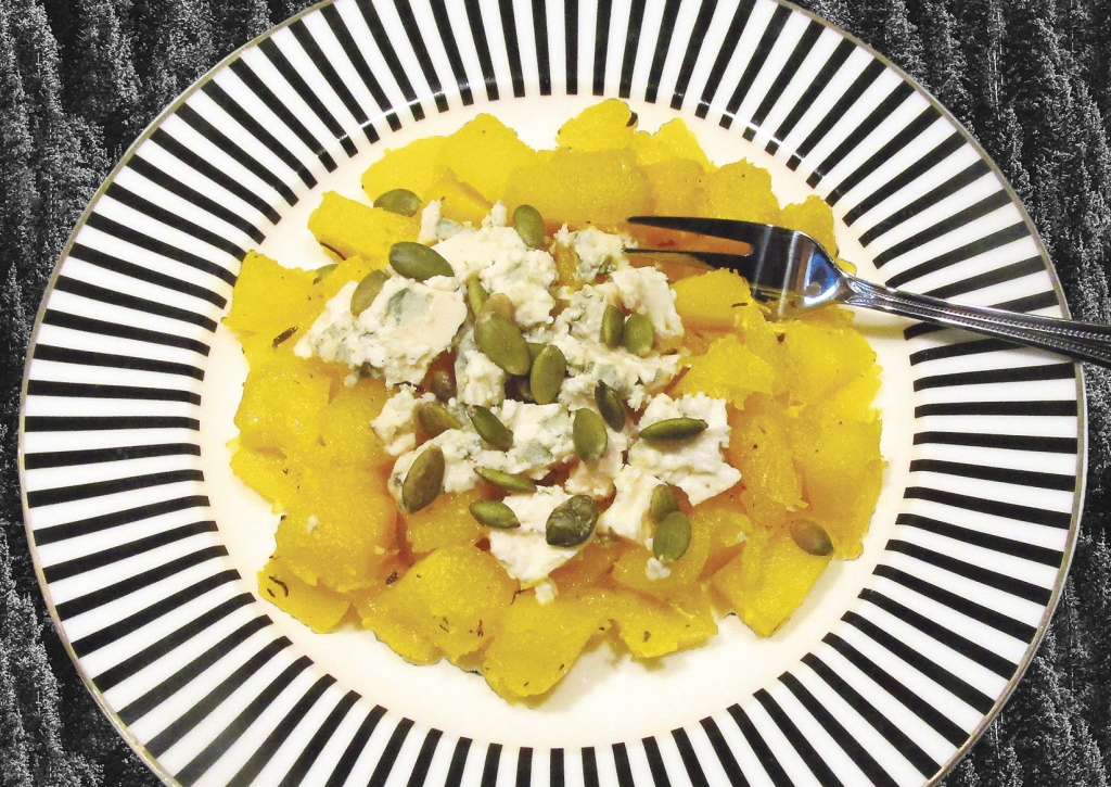 Lobītas ķirbju sēklas pakaltēju uz sausas pannas apmēram trīs minūtes. Zilo sieru sadrupināju. Gatavos ķirbjus izliku uz šķīvja un pārkaisīju ar sieru un sēkliņām.