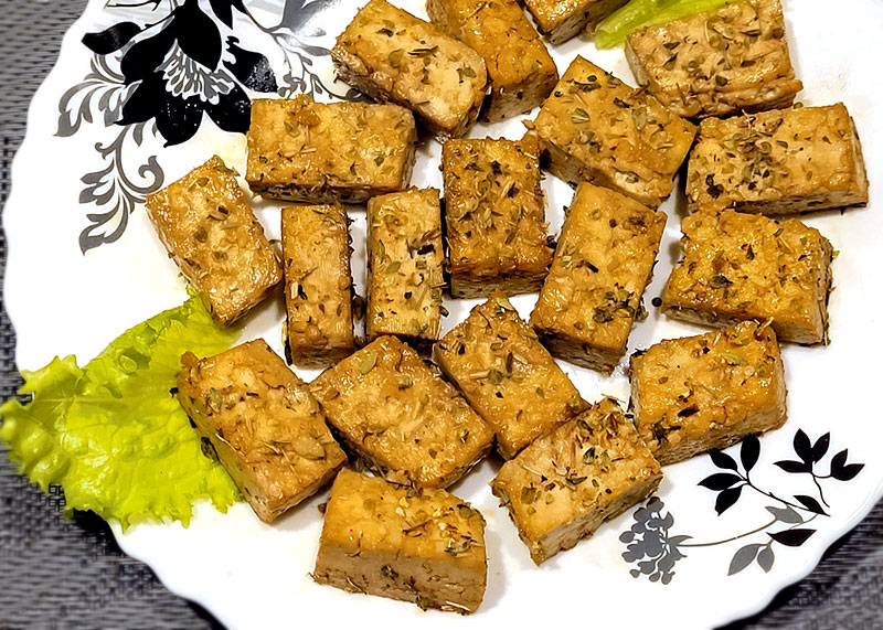 TOFU SIERU SAGRIEZU vidēji lielos garenos gabaliņos apmēram centimetra biezumā. Pannā uzkarsēju “Extra virgin” olīveļļu, pa visu pannu izkārtoju tofu gabaliņus un apcepu tos vispirms no vienas puses, pēc tam – no otras un plīts karstumu izslēdzu. Ilgi cept nevajag, pa minūtēm 3–4 no katras puses. Ja pannā karstums būs par lielu, tofu kļūs sauss un apdegs, bet, ja pannā karstums mazs, gabaliņiem nebūs zeltainas garoziņas.