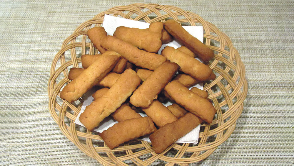 Olas dzeltenums jāsaputo ar cukuru (šoreiz gan tiku pielikusi visu olu, jo tās baltumam atsevišķi tobrīd nebiju plānojusi pielietojumu; cepumi bija gardi tāpat, taču labāk pieturēties pie receptes un izmantot tikai olas dzeltenumu). Pievienoju izkausētu margarīnu, kas paredzēts cepšanai, kā arī majonēzi, sodu un vaniļas cukuru. Visu labi samaisīju. Iegūtajai masai piekaisīju miltus un samīcīju mīklu. To savēlu bumbā, ietinu pārtikas plēvītē un uz pusstundu ievietoju ledusskapī. Pēc tam mīklu izveltnēju un ar robainu nazi sagriezu strēmelītēs. No izveltnētās mīklas, pēc patikas, ar veidnītēm varam izspiest arī dažādas figūriņas. Strēmelītes izkārtoju uz plāts, kas izklāta ar cepamo papīru, un cepu minūtes 15, līdz tie tapa zeltaini brūni. Cepšanas laiks atkarīgs gan no krāsns, gan cepumu biezuma un lieluma.