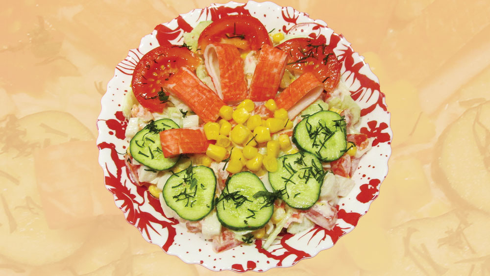 Gurķi un tomātu nomazgāju un sagriezu gabaliņos, arī krabju nūjiņas. Pievienoju konservēto kukurūzu. Bļodiņā samaisīju skābo krējumu ar sinepēm un sāli un uzmanīgi sajaucu ar pārējām salātu sastāvdaļām. Un – salāti gatavi! Tos varam arī atstāt nedaudz ievilkties un baudīt mazliet vēlāk.
