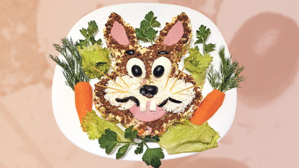 Pēc iepriekš uzzīmēta šablona uz lēzenā šķīvja veidoju truša “sejiņu” ar ausīm, to viegli pārsmērēju ar majonēzi un pārkaisīju ar sarīvētu rupjmaizi, lai būtu košāka “spalva”. Vaigiem izmantoju sarīvētos olas baltumus, actiņām – olas baltumus un melnās olīvas. Ausīm, kā arī mutītei piegriezu desas šķēlītes. Ūsas veidoju no spageti makaroniem. Trusītis ir arī “jāpabaro”, tādēļ tam tika burkāni un citi zaļumi.