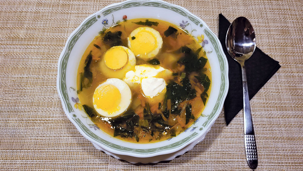 Spinātus noskaloju, apsusināju un sagriezu. Tos īsi pirms dārzeņu gatavības pievienoju katlā, pieliku arī konservēto liellopa gaļu, uzvārīju un pāris minūtes pavārīju. Visbeidzot pēc garšas piemetu sāli, cik vēl šķita vajadzīgs, un nocēlu katlu no uguns. Karsto zupu šķīvī varam papildināt ar skābo krējumu un sagrieztu vārītu olu.