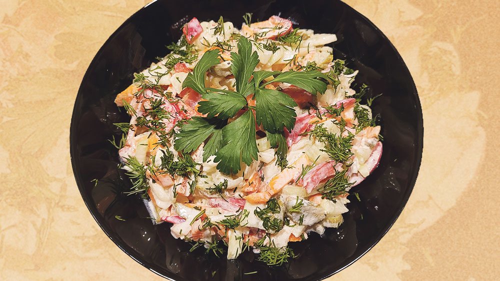 Kad sīpoli pēc minūtēm desmit jau bija iemarinējušies, tos samaisīju ar pārējiem sagrieztajiem dārzeņiem, piejaucu skābā krējuma mērci un salātus pārkaisīju ar sasmalcinātiem zaļumiem.