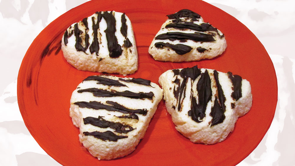Šokolādes tāfelīti izkausēju, pievienoju skābo krējumu un karsējot maisīju, līdz masa kļuva viendabīga. Ar to pārlaistīju putotās masas sirsniņas un ievietoju atpakaļ vēsumā, lai glazūra sacietē.