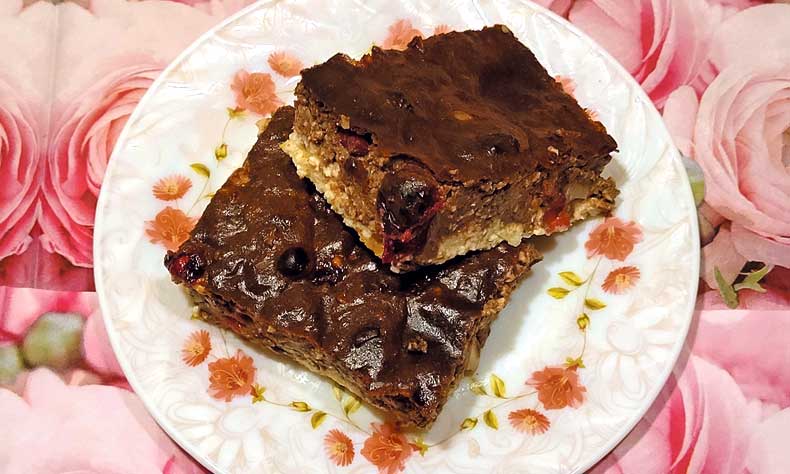 Atlikušajai biezpiena masai pievienoju ēdamkaroti kakao pulvera un lielogu dzērvenes. Visu labi samaisīju un izlīdzināju šokolādes masu veidnē virs baltās kārtas.