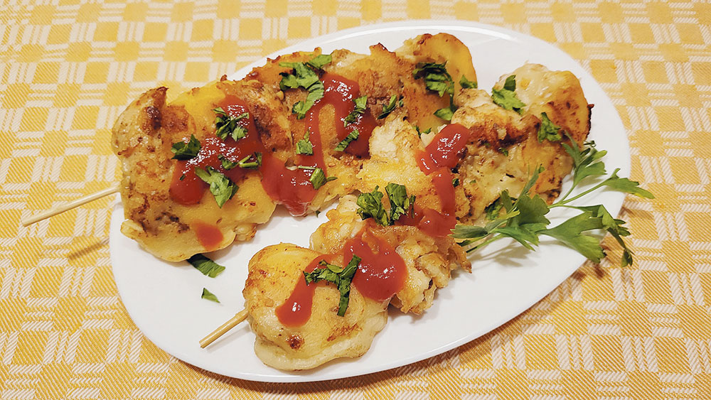 Mīklai olas samaisīju kopā ar kefīru. Atsevišķi sajaucu miltus ar cepamo pulveri, pēc tam piemaisīju olām ar kefīru. Filejas gabaliņus apmērcēju mīklā, savēru uz bambusa iesmiņiem un liku cepties pannā ar augu eļļu uz nelielas uguns. (Ja mīklu pārliesim dziļākā traukā, varbūt izdosies tajā apmērcēt uz iesmiņiem jau savērtus gaļas gabaliņus reizē.) Vispirms apcepu vienu pusi, tad iesmiņus apvērsu uz otru pusi un nu jau zem vāka cepu gaļu līdz zeltainai garoziņai. Pēc tam iesmiņus vēl izliku uz papīra dvieļa, lai tur uzsūktos liekās taukvielas. Gaļa izdevās, mīksta, maiga un ļoti garšīga. Piedevām varam pasniegt galdā arī kādu mērcīti. Tā kā šoreiz fileju man bija mazāk par receptē norādīto daudzumu, mīkla palika pāri, taču no tās izcepu pankūciņas.