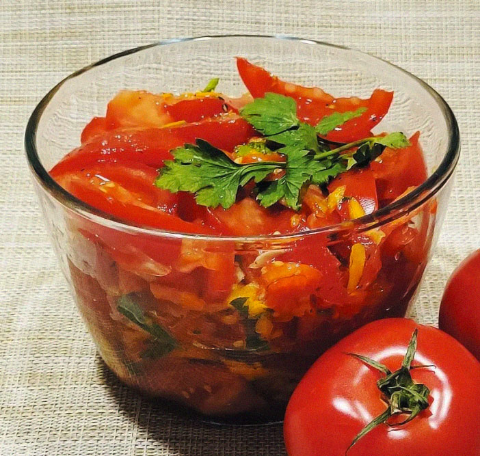Stikla traukā kārtoju vispirms tomātus, tad – saldo piparu, burkānu, ķiploku un zaļumu maisījumu, ko pārkaisīju ar Korejas burkānu pagatavošanai paredzēto garšvielu (to savulaik biju iegādājusies tirdziņā). Kārtas atkārtoju. Visu pārlēju ar pagatavoto marinādi, uzliku traukam vāku, saturu vēl uzmanīgi sakratīju un ievietoju uz diennakti ledusskapī.