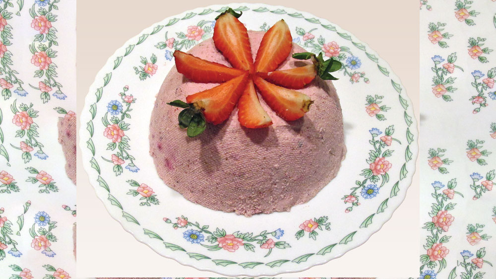 Dubultā salocītu marles gabalu viegli samitrināju un nospiedu. Ar to izklāju atbilstoša izmēra caurduri, izlīdzināju tajā biezpiena un ogu masu, pārsedzu ar marles galiem un uzliku nelielu slogu. Caurduri ievietoju bļodā, lai tajā varētu notecēt liekais šķidrums, kas jānolej. Liku visu ledusskapī uz 12 stundām. Pēc tam gardumu apvērsu uz lēzenā šķīvja un noņēmu marli. Deserta greznošanai izmantoju svaigas ogas.