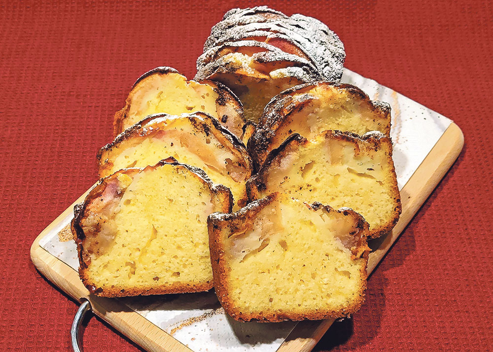 Sarkanus ābolus nomazgāju, apsusināju, nemizotiem izgriezu serdes, bet mīkstumu sagriezu plānās pusdaiviņās. Tās iebakstīju mīklā pamīšus divās rindās, līdz noklāju visu virspusi. Pārsijāju ēdamkaroti pūdercukura un kanēļa maisījuma. Virsū vēl izkārtoju mazos gabaliņos sagrieztu sviestu, kas palika pāri pēc veidnes ieziešanas. Liku veidni līdz 170–180 grādiem uzkarsētā cepeškrāsnī vismaz uz 45 minūtēm. Gatavību pārbaudīju ar koka iesmiņu: ja tas nav aplipis ar mīklu, kēkss ir gatavs. Atdzisušu gardumu izņēmu no veidnes, pārkaisīju ar atlikušo pūdercukuru un griezu šķēlēs.