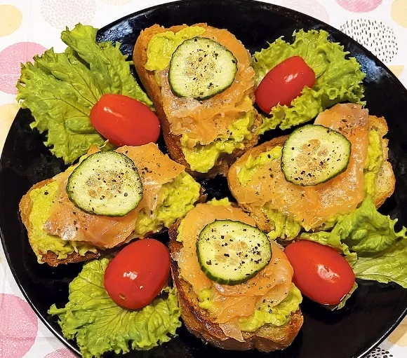 Avokado pārgriezu uz pusēm un izņēmu kauliņu. Mīkstumu nomizoju un sablendēju viendabīgā masā kopā ar ķiploka daiviņu, citrona sulu un sāli pēc garšas. To pārsmērēju maizes šķēlītēm, tad tās pārklāju ar mazsālīta laša strēmelītēm un rotāju ar svaiga gurķa ripiņām.