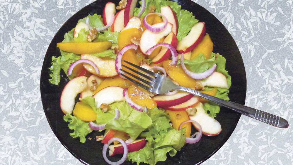 Hurmas nomazgāju, nomizoju un sagriezu šķēlītēs. Sarkano sīpolu sagriezu pusgredzenos, ābolu – daiviņās. Augļus viegli sajaucu, izkārtoju uz saplucinātām salātu lapām un pārlēju ar mērci. To pagatavoju, sajaucot olīveļļu ar citrona sulu un sojas mērci.