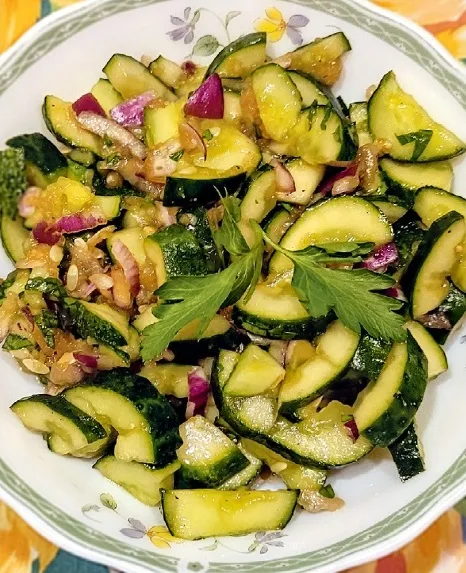 Nomazgāju vairākus gurķus un nogriezu tiem galiņus. Gurķus liku uz dēlīša un ar mīklas rulli “iekaustīju”, lai izdalās sula, kas šiem salātiem nav vajadzīga. Tad tos pārgriezu gareniski uz pusēm, pēc tam sagriezu gabaliņos. Pārliku gurķus bļodā pie mērcītes un pievienoju smalki sagrieztus sīpolus un pētersīļu zaļumus. Piemetu nedaudz sāls un visu samaisīju. Vēl varam uzkaisīt arī sedzama sēkliņas un tad celt galdā.