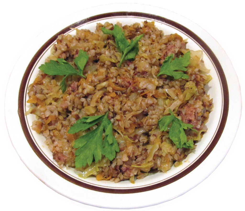 Lai gan receptē, pēc kuras vadījos, tas nebija minēts, šķita, ka sīpols šim ēdienam nekaitētu, tādēļ vispirms nomizoju un sagriezu krietnu sīpolu un dziļajā pannā ar augu eļļu to apcepu līdz zeltainumam. Tad turpat pievienoju sasmalcinātus kāpostus un notīrītu un uz rupjās rīves sarīvētu burkānu. Piekaisīju sāli, piparus, paprikas pulveri, visu sajaucu un vairākas minūtes pacepu. Pēc tam pieliku tomātu pastu un cukuru un cepu dārzeņus līdz gatavībai. Nu varēju pievienot konservētu sautēto gaļu un visbeidzot – arī iepriekš izvārītos griķus. Visu kopā labi samaisīju un vēl dažas minūtes pakarsēju, pēc tam noņēmu no uguns un ļāvu pannā zem vāka vēl pastāvēt 10 – 15 minūtes.