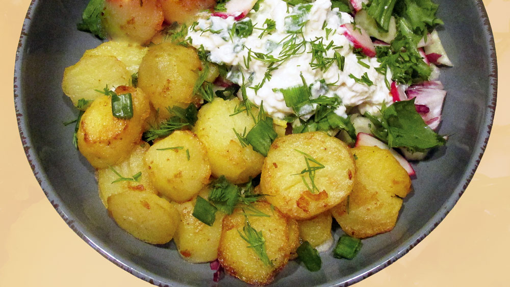 Labi nomazgātus jaunos kartupeļus ar mizu izvārīju, pēc tam gan tos nolupināju (ja kartupelīši mazi, miziņu varam atstāt) un sagriezu ripiņās. Pannā uzkarsēju eļļu, izkausēju tajā sviestu un cepu tur kartupeļus no abām pusēm, līdz tie zeltaini. Tad izliku uz papīra dvieļa, lai uzsūcas liekās taukvielas. Gurķus un redīsus sagriezu pusripiņās, saplucināju vairāku veidu salātu lapas, liku tos bļodā, apslacīju ar citronu sulu un samaisīju. Fetas sieru ar dakšiņu sadrupināju, pievienoju sasmalcinātus ķiplokus, zaļumus, garšvielas, citrona sulu un jogurtu. Visu labi samaisīju, savienoju ar dārzeņiem un apjaucu. Liku salātus šķīvī, tur izkārtojot arī kartupeļus. Te gan vēl klāt “piedomāju” arī ceptu cāļa krūtiņas fileju…