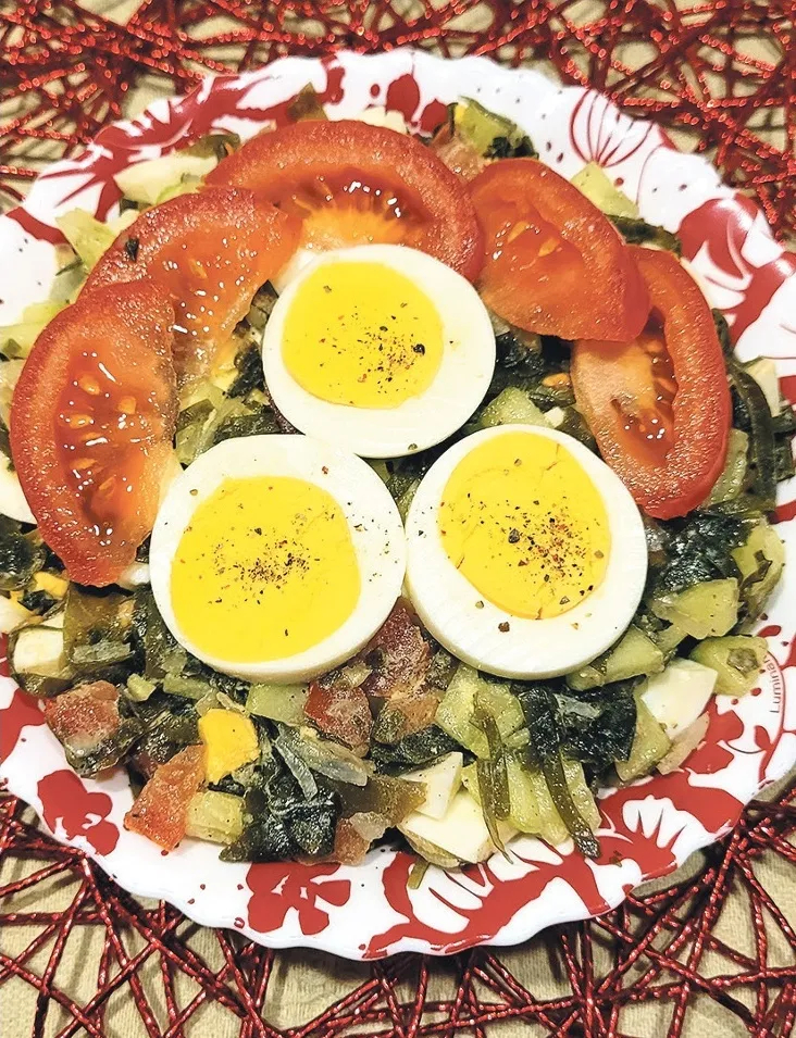 Jūras kāposti – produkts skaistumam un veselībai, tādēļ šoreiz iegādājos otra veida veikalā pieejamos, kas ir sagatavoti jau ar eļļu. Izvārīju olas, tās atdzesēju, nolobīju un sagriezu palielos gabaliņos. Gurķi un tomātus nomazgāju, apsusināju papīra dvielī un sagriezu nelielos kubiņos.