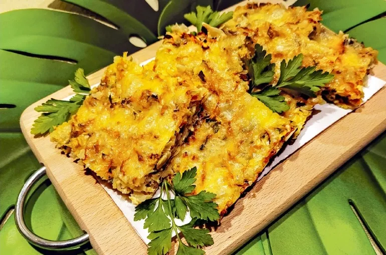 Plāti izklāju ar cepamo papīru, ko vēl mazliet ietaukoju ar augu eļļu, un tur vienmērīgā kārtā izlīdzināju dārzeņus ar mīklu un ievietoju līdz 170–180 grādiem uzkarsētā cepeškrāsnī. Pēc pusstundas pārkaisīju ar rupji sarīvētu sieru un ievietoju atpakaļ krāsnī vēl uz apmēram desmit minūtēm, līdz siers bija izkusis un kļuvis zeltains.