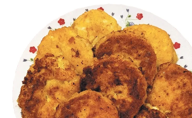 GARŠĪGAS UN SĀTĪGAS KOTLETES varam pagatavot, neizmantojot gaļu. Lai gan arī te, pēc izvēles, cepot sīpolus, varam pievienot nedaudz smalki sagriezta kūpināta bekona. Nomizotus kartupeļus liekam vārītā pasālītā ūdenī un vārām gatavus, tad nokāšam. Nomizotus sīpolus smalki sagriežam, liekam pannā ar uzkarsētu augu eļļu un cepam, līdz tie mīksti un viegli zeltaini, pēc tam pievienojam katlā un kopā ar kartupeļiem sastampājam biezenī. Ātrākam rezultātam te šoreiz izmantoju veikalā iegādātos gatavos kartupeļus ar bekonu un sīpoliem, tos sastampāju un tad, kā norādīts receptē, pievienoju arī olu un biezpienu un piekaisīju sāli un piparus. Visu labi samaisīju un visbeidzot piejaucu arī miltus. No masas veidoju nelielas kotletītes, apviļāju rīvmaizē un cepu pannā ar uzkarsētu augu eļļu līdz zeltainai garoziņai vispirms no vienas puses, tad uzmanīgi apgriezu un cepu no otras. Gatavošanas beigās tās vēl zem vāka dažas minūtes pacepu uz nelielas uguns. Garšoja lieliski tāpat, bez piedevām, taču šādas kotletītes varam baudīt arī kopā ar skābo krējumu vai kādu citu iecienītu mērci.
