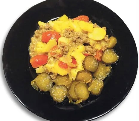 Pannā ar sakarsētu augu eļļu iedrupināju malto gaļu – cūkgaļas vietā te varam izmantot citu pēc savas izvēles. Tās un kartupeļu daudzumu arī varam variēt atkarībā no ēdāju skaita un pannas dziļuma. Apmaisot gaļu strauji apcepu. Tad pievienoju sasmalcinātus sīpolus, kā arī sāli un piparus un dažas minūtes pasautēju. Nu bija kārta spiedē sasmalcinātiem ķiplokiem un kaltētajam timiānam. Visu atkal mazliet pasautēju. Pēc tam pieliku nomizotus un šķēlēs sagrieztus kartupeļus, piekaisīju apmēram ēdamkaroti kurkumas un pārlēju karstu ūdeni tā, lai pannas saturs būtu tikko pārklāts. Uz nelielas uguns visu zem vāka sautēju apmēram 15 minūtes, līdz kartupeļi kļuva mīksti. Nu pievienoju arī uz pusēm pārgrieztus ķirštomātiņus, atkal uzliku pannai vāku un sautējumu pakarsēju dažas minūtes. Pēc garšas vēl varam piebērt sāli un piparus, kā arī gatavo ēdienu pārkaisīt ar sasmalcinātiem pētersīļu zaļumiem.