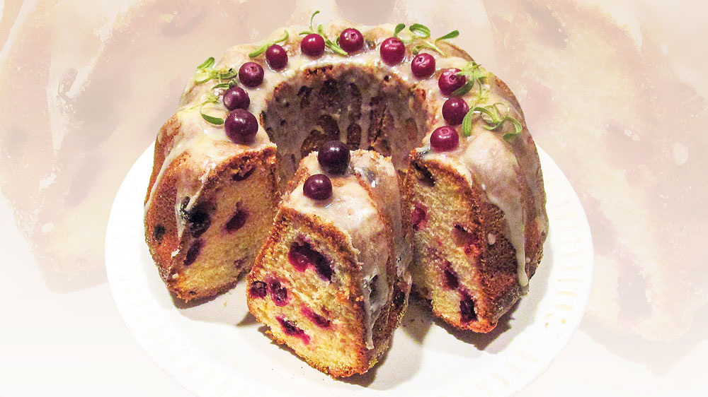 Mīklu izlīdzināju ar eļļu ietaukotā un ar mannu nedaudz izkaisītā kēksu cepamajā veidnē ar tukšu vidu un liku līdz 180 grādiem uzkarsētā cepeškrāsnī uz apmēram 45 minūtēm. Gatavo kēksu mazliet padzesēju veidnē, tad no tās izņēmu un pārliku uz restītēm. Glazūrai pūdercukuru samaisīju ar apelsīna sulu, ar to pārklāju atdzisušo kēksu un, kamēr tā vēl nebija sacietējusi, virsu izrotāju ar dzērvenēm.