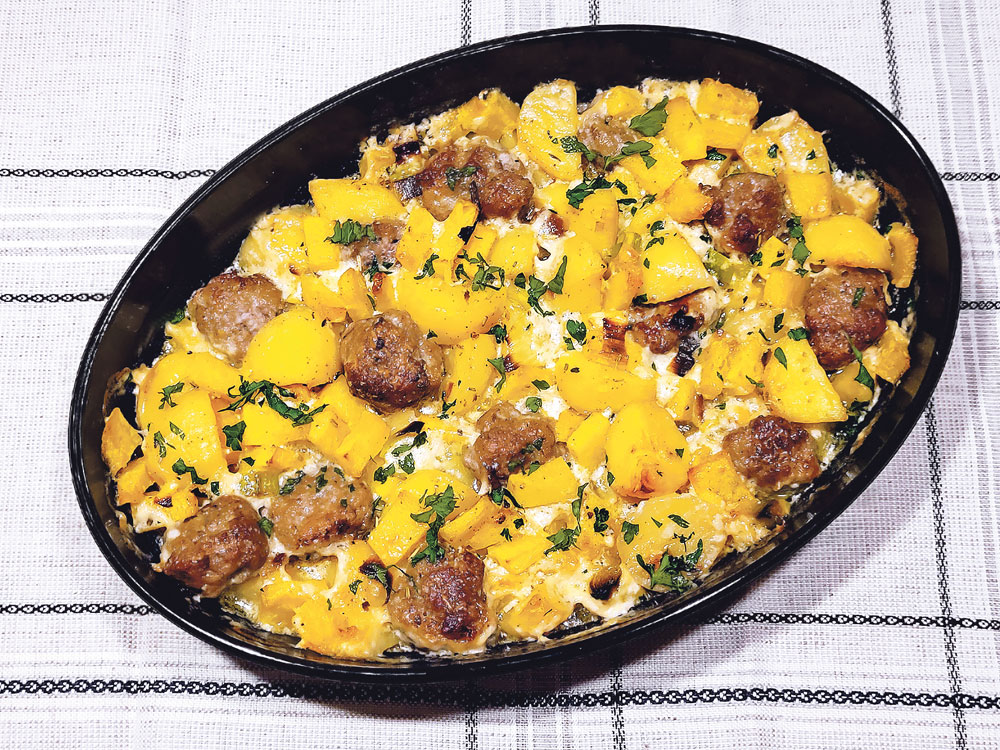 Ķirbju un kartupeļu sacepums ar maltās gaļas bumbiņām