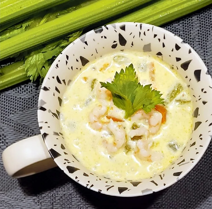 PURAVU, selerijas kātus un notīrītus burkānus noskaloju, apsusināju un sagriezu. Visu katlā nelielā augu eļļas daudzumā apcepu, tad pievienoju arī mazliet vārīta ūdens un sautēju, līdz dārzeņi mīksti. Pēc tam pielēju vēl ūdeni, kokosriekstu pienu, uzvārīju un karsēju uz lēnas uguns vismaz pāris minūtes. Tad pievienoju arī sagrieztu ingveru, citrona sulu, kariju un vārīju vēl vismaz divas minūtes. Pagatavoto zupu lēju bļodiņās un greznoju ar nesen iegādātajām un ledusskapī jau piemirstajām, toties šim ēdienam lieliski piemērotajām gatavajām garnelēm no sālījuma.