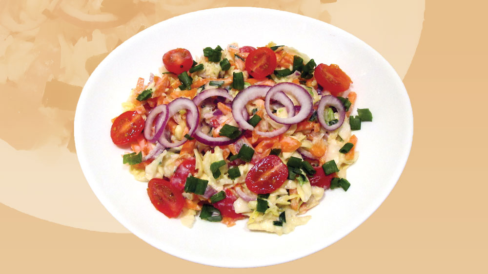Kāpostus ar nazi sasmalcināju, burkānus sagriezu salmiņos, sīpolu – plānos pusgredzenos, bet zaļumus – smalki. Visu bļodā sajaucu, pievienojot sāli un piparus. Ķirštomātiņus pārgriezu uz pusēm un pievienoju pēdējos.