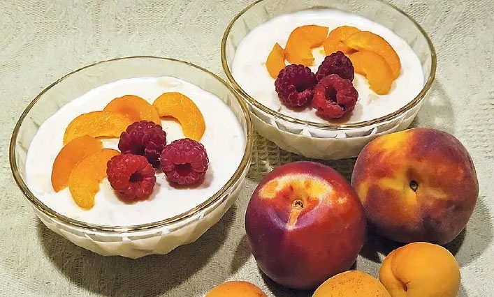 Persikiem un aprikozēm izņēmu kauliņus un augļu mīkstumu sagriezu smalkos gabaliņos. Želatīnu pārlēju ar pienu un atstāju uzbriest, pēc tam to uz nelielas uguns izšķīdināju, neļaujot uzvārīties.