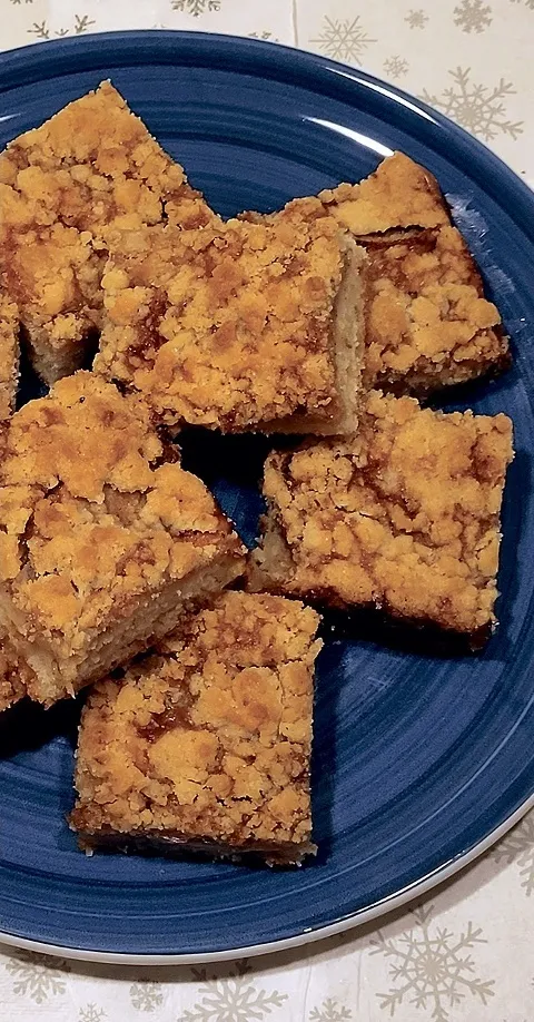 Veidni (man bija 30 x 24 cm, taču var būt arī nedaudz lielāka, tad kūka būs plānāka) izklāju ar cepamo papīru, izlīdzināju tajā ābolu mīklu, pāri izkārtoju ar kanēli un medu samaisītās ābolu šķēlītes un visu pārkaisīju ar drumstalām. Gardumu cepu līdz 180 – 185 grādiem uzkarsētā cepeškrāsnī vismaz 45 minūtes.