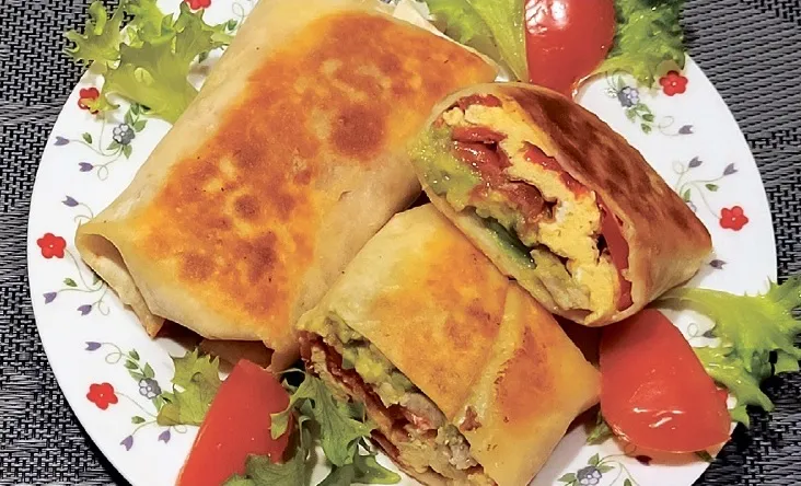 Nelielās, 20 centimetru diametra, tortiljās pildīju pa gabalam omletes ar tomātiem, vārīta šķiņķa šķēlīti un avokado masu un salocīju tā, lai pildījums paliek iekšpusē. “Aploksnītes” liku uz pannas un nelielā augu eļļas daudzumā apcepu no abām pusēm, līdz tās kļuva zeltaini brūnas un kraukšķīgas.