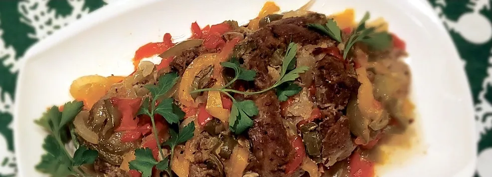 Nomizotus sīpolus sagriezu pusgredzenos, trīs krāsu – sarkano, dzelteno un zaļo – saldos piparus nomazgāju, iztīrīju no sēkliņām un sagriezu salmiņos, bet notīrītus ķiplokus – plēksnītēs. Dārzeņus samaisīju ar atlikušo paredzēto eļļu un sāli. Uz folijas loksnēm, ko mazliet ietaukoju ar augu eļļu, liku pa gaļas gabalam, to iegriezumus piepildīju ar sagrieztajiem dārzeņiem un katru satinu tā, lai “šuve” atrastos virspusē. Folijā ietītās paciņas liku nedaudz ar augu eļļu ietaukotā veidnē un ievietoju līdz 200 grādiem uzkarsētā cepeškrāsnī. Gatavošanai, cepšanas laiks atkarīgs no krāsns, vajadzēja apmēram pusotru stundu, tad foliju atvēru un liku veidni ar gaļu atpakaļ cepeškrāsnī vēl uz minūtēm 20 – 30, lai cepetis apbrūninās. Nu tas kļuva mīksts un sulīgs.