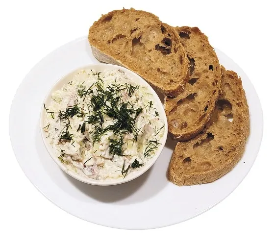 Zivij jānovelk āda un jāizņem asakas. Vienu iztīrīto fileju sagriezu nelielos gabaliņos. Nomizoju sarkano sīpolu un sīki sagriezu. Smalki sagriezu arī nomizotu svaigo gurķi. Tiem pievienoju krēmsieru un nedaudz graudaino sinepju, kā arī sasmalcinātus diļļu zaļumus. Visu labi samaisīju un pārkaisīju ar zaļumiem. Dekoratīvi šāds ēdiens izskatītos, ja servēšanai izmantotu īpašu formiņu vai noņemamo gredzenu un masu labi sapresētu – kā tartaru. Šai uzkodai labi pieder grauzdēta vai svaiga maizīte pēc izvēles.