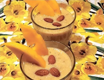 Pilngraudu auzu pārslas pārlēju ar 250 mililitriem mandeļu piena un trauku pa nakti atstāju ledusskapī, lai pārslas izmirkst. Nākamajā rītā blendera krūzē tām pievienoju nomizotus un gabalos sagrieztus banānus un mazākos gabaliņos sagrieztu nomizotu mango, mazliet no tā atstājot rotāšanai. Visu sablendēju viendabīgā masā un piemaisīju citrona sulu. Pēc tam dzērienu salēju glāzēs, dekorēju ar mango šķēlītēm, kā arī mandelēm. Te derētu arī, piemēram, sakapātas pistācijas.