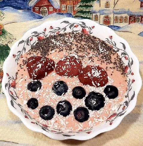 Banānus un aromātiskās ogas liku blendera krūzē, pievienoju kokosriekstu pienu un visu kopā sablendēju. Ja šo desertu vēlamies olbaltumvielām bagātāku, te varam pievienot arī pāris ēdamkarotes biezpiena. Šoreiz gan to nepieliku. Masu lēju bļodiņā un rotāju ar lielogu mellenēm, kādu zemeņu ogu, kā arī uzkaisīju čijas sēklas un kokosriekstu skaidiņas.