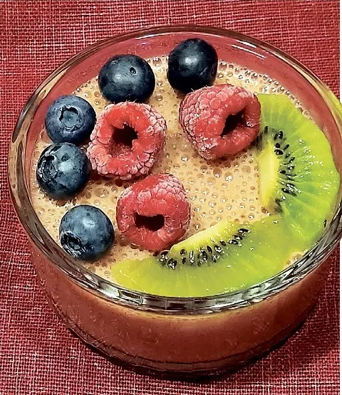 Uzbriedušo želatīnu pakarsējot izšķīdināju, to uzvārīt nevajag, tad pievienoju sablendētajām sastāvdaļām un ar mietveida mikseri visu vēl nedaudz pakūlu. Pēc tam pašķidro masu salēju stikla trauciņos un ievietoju ledusskapī sastingšanai. Desertu rotāju ar tobrīd pieejamajām ogām un augļiem.